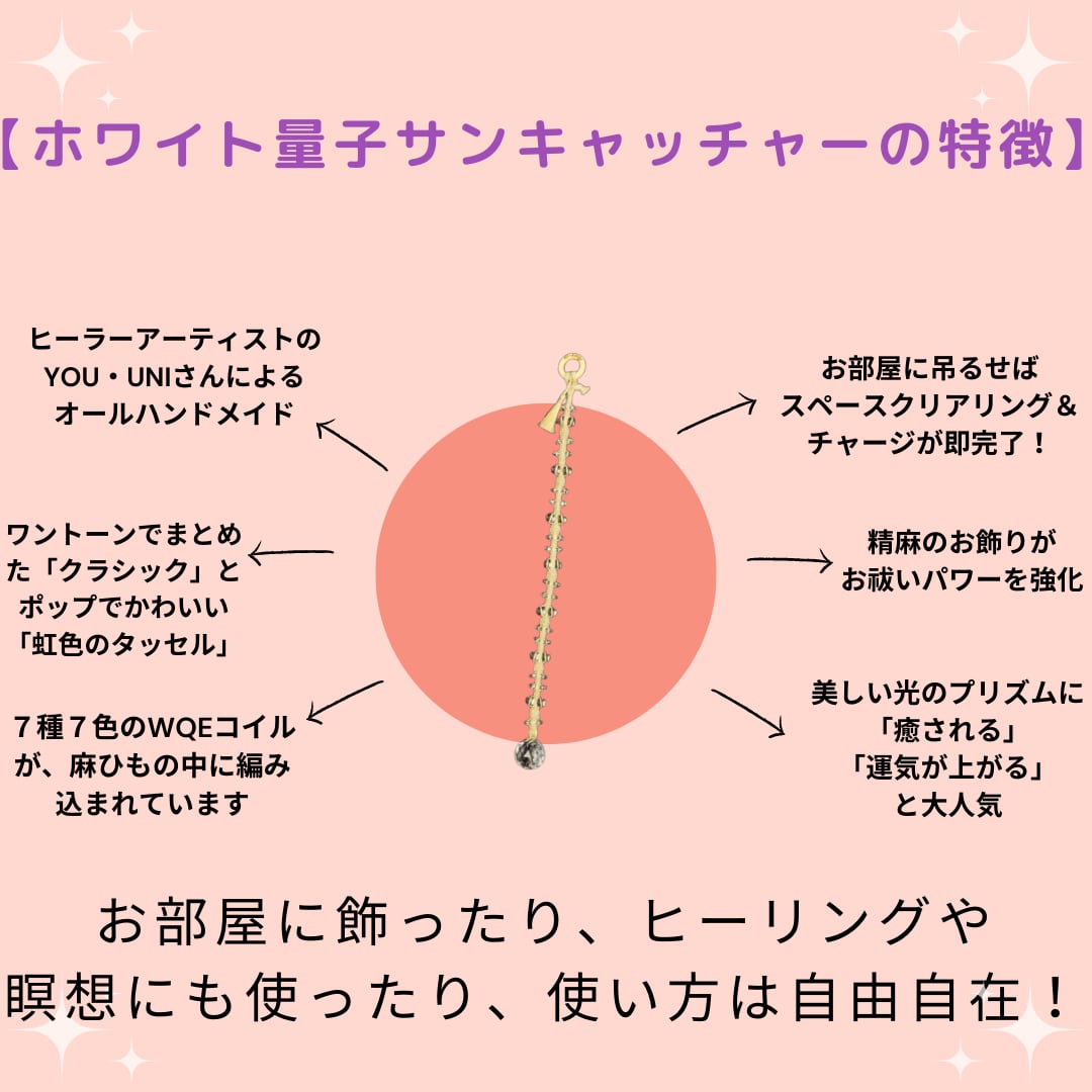 部屋に吊るすだけでなく、体の上に置いてヒーリングしたり、手に持って瞑想したりと、サンキャッチャーの枠を超越した「水晶とHEMPのホワイト量子サンキャッチャー」が手に入るのはココだけです!